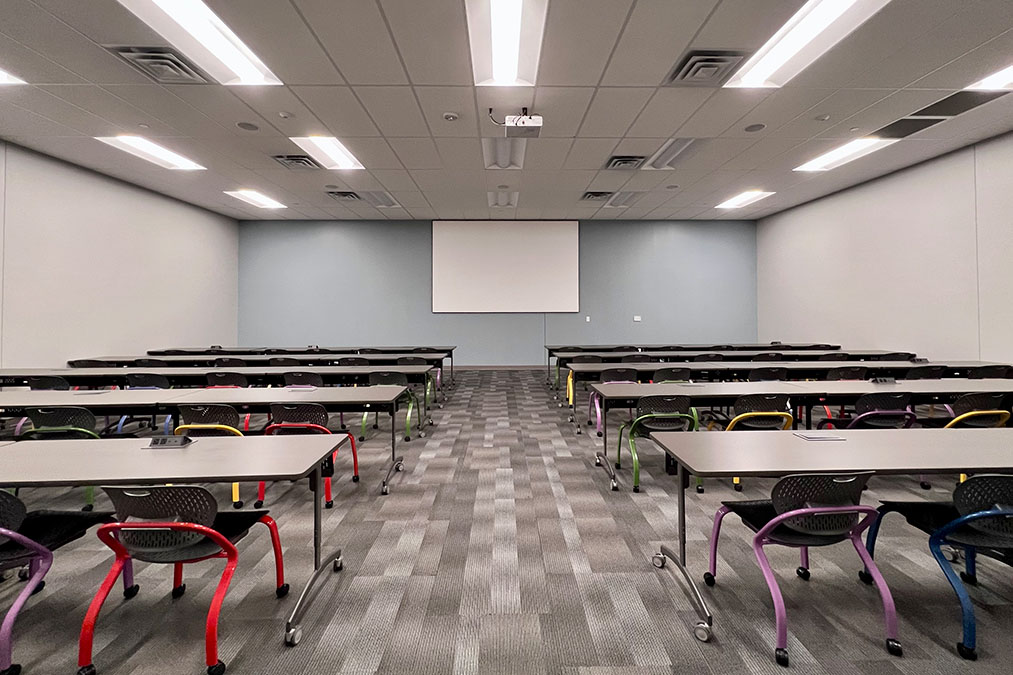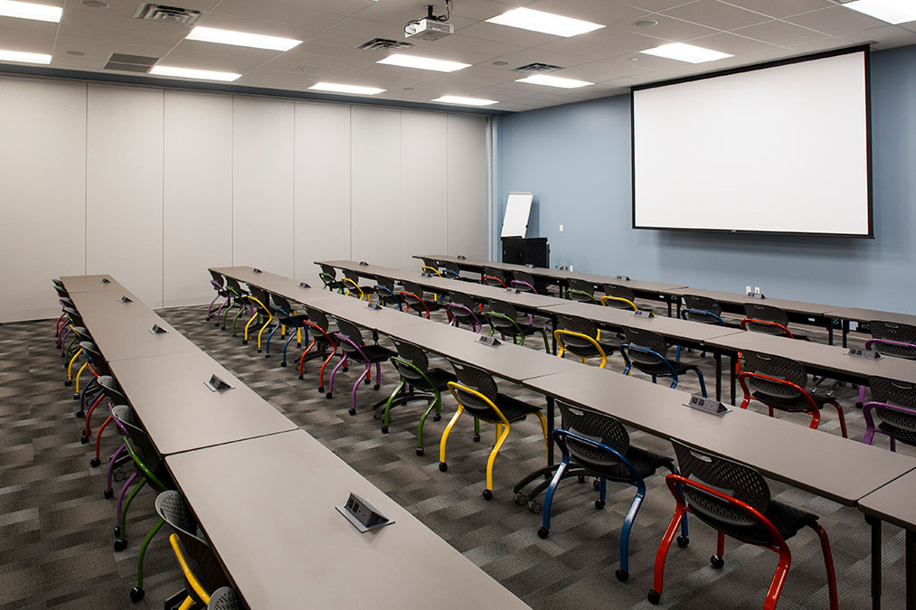 With its adaptable seating and large exterior windows, dedication can host any kind of gathering. Whether you’re looking to have a board meeting, host team-building activities, facilitate discussions, or make a presentation, this room can make it happen. Complete with a screen, podium, AV equipment, and device hookups, you’ll be ready for anything.